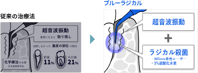 ブルーラジカル治療は、過酸化水素に405nmの青色光を照射することで生成されるヒドロキシルラジカルにより、歯周病の原因菌を99.99%除菌します。
